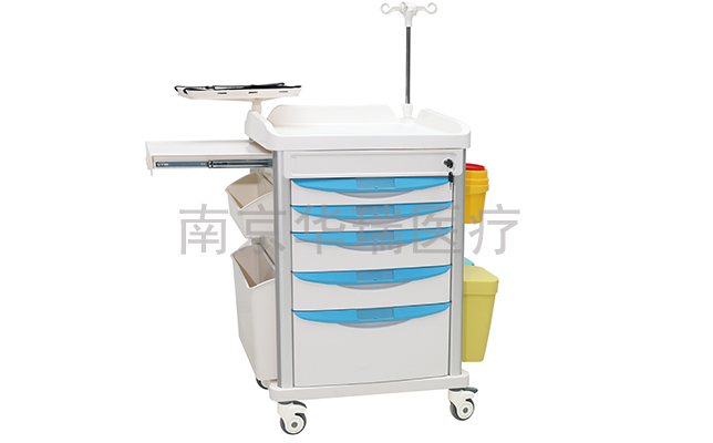 4.车体右侧:伸缩输液架ABS工程塑料材质一次成形,可载重2-5KG,四只回旋式挂钩(输液架可与左侧平台左右互换), 旋转式3升圆形锐器盒,翻盖分色垃圾桶175*175*280MM,双色用于垃圾分类(黄色医疗废弃物为损伤性垃圾, 绿色生活垃圾为感染性垃圾);