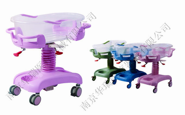 结构组成:调控可倾斜、ABS婴儿睡筐、ABS床架、手动控制装置、升降机构、包布海绵床垫(粉色、蓝色及绿色可供选择)。承载重量:90Kg。床面折起角:0~±15°。
