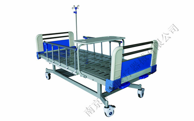 结构组成:双摇、钢塑复合床头(尾)喷塑床面、喷塑床架、升降输液杆、折叠式护栏、脚轮、带缓冲餐板、带刹。床面折起角:α≥65° β≥50° γ≥50°或 α≥120°。承载重量:240Kg