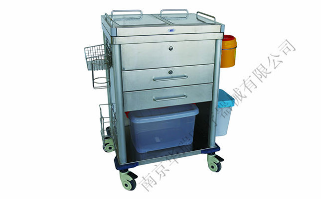 3. 配置:一斗两抽,左侧:不锈钢储物篮1只,消洗液瓶架1只,病历夹篮1只;右侧:优质塑料翻盖污物桶1只,3升锐器盒1只,压膜带收集盒1只;后部:护士圆凳1只;前部:输液空瓶、空袋收纳盒(500X400X320) 1只;