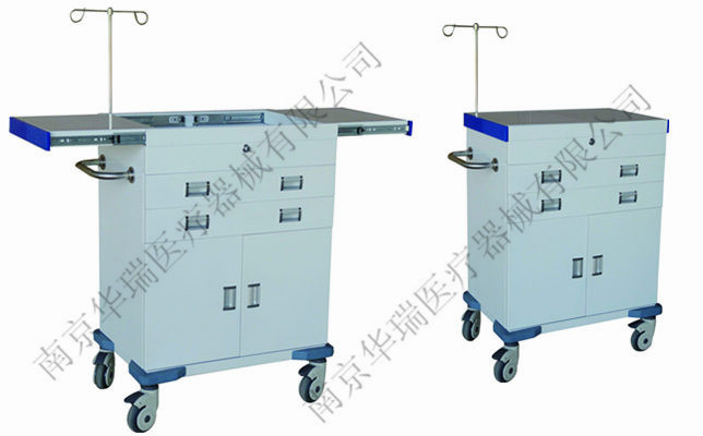 备注:台面左右平推双开门,上层空间内及第一层抽屉配有48格,塑料药盒各一只,下柜体双开门,一层隔板;车体配可升降盐水瓶架,复苏抢救板,台面尺寸:660×420