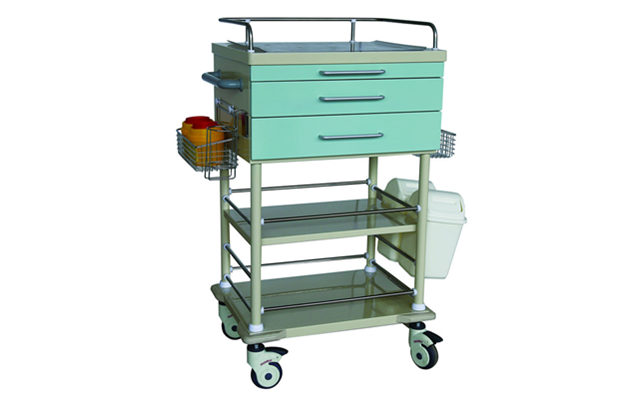 备注:优质不锈钢及铝合金材质、三层双抽一抽板、长方药盒2个、台面温馨米黄、抽屉湖绿、两方污物桶、一消毒瓶架、二网筐、一药盘、二利器盒。(选用优质静音轮、静音伸缩导轨、并可根据客户需求更改颜色、尺寸或配色)